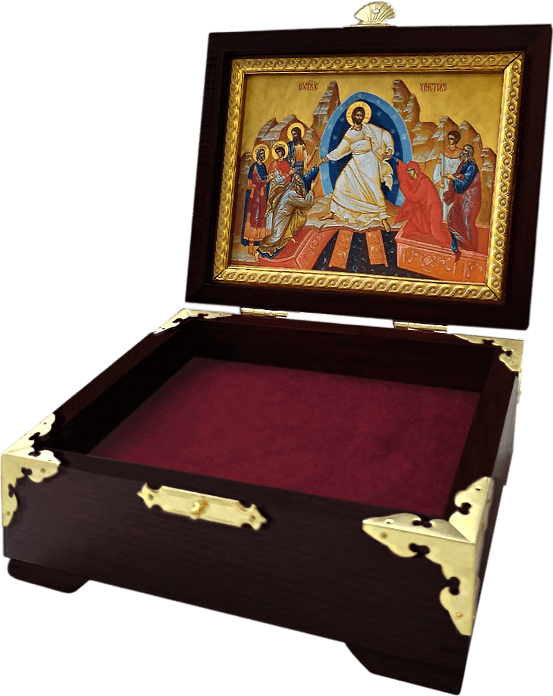• На внутренней стороне крышки располагается икона, обрамленная узким золоченым багетом.