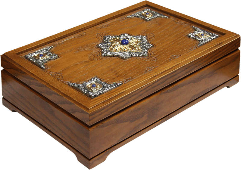 • Крышка украшена резьбой, серебрением, золочением, натуральными камнями.