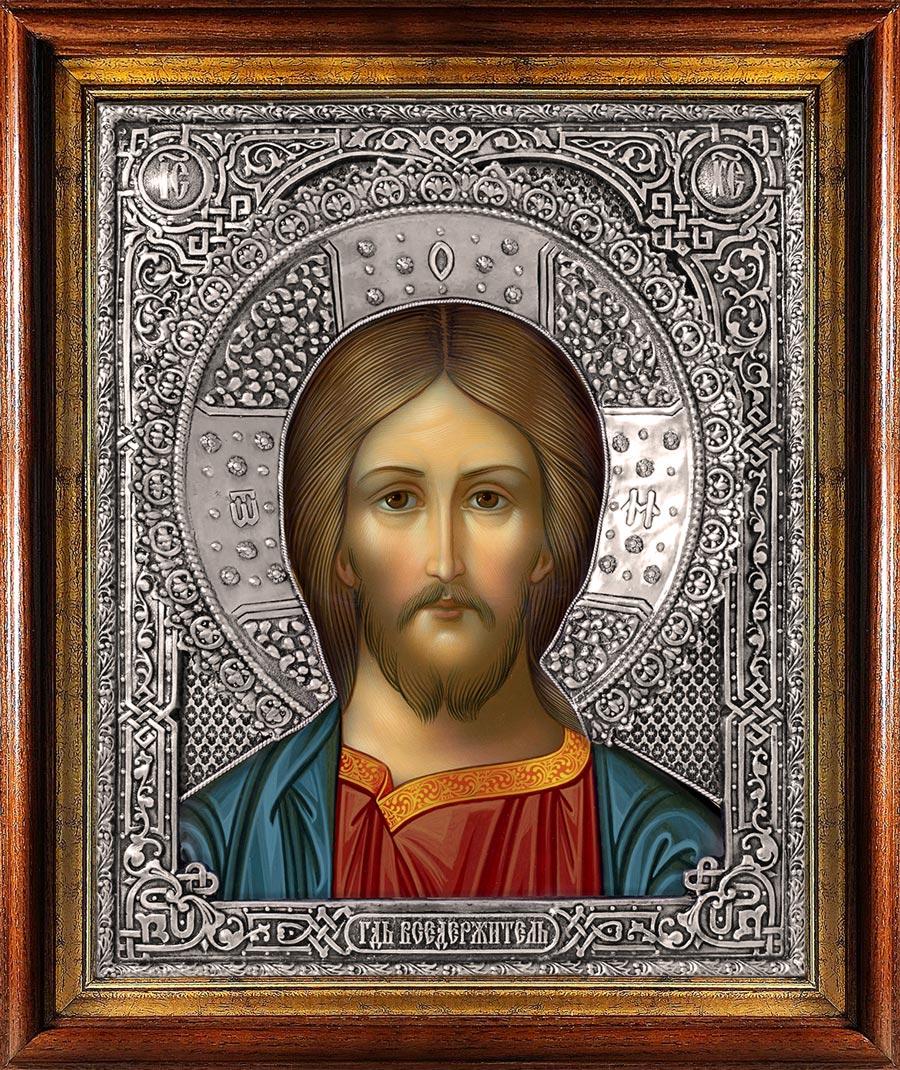 Икона Господа Вседержителя в посеребренной ризе (окладе) в басменном киоте, Р-9К