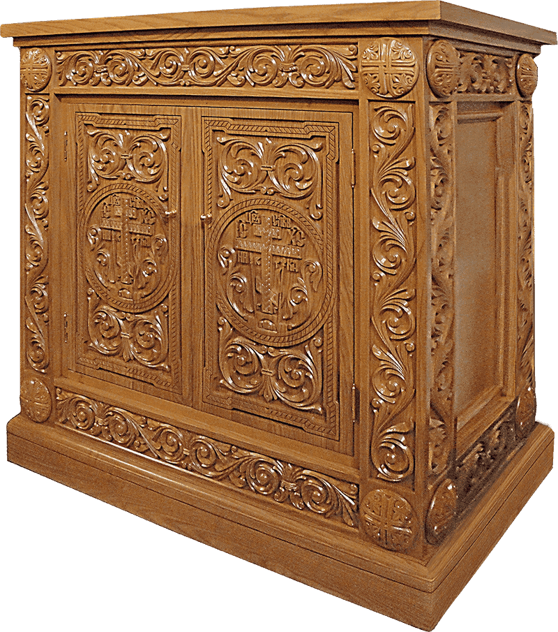 • Жертвенник деревянный с элементами резьбы. Являясь незаменимым элементом храмовой мебели, часто жертвенник в алтаре выполнен в едином стиле и гармонии с облачением на престол, подвесными и напольными киотами, троном при оформлении Горнего места.