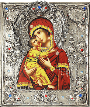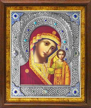 Иконы Пресвятой Богородицы Девы Марии в посеребренном окладе под старину выполнен в традициях иконописи мастеров XIX века методом УФ печати. Краски отличаются высокой износостойкостью, влагостойкостью, атмосферостойкостью, а следовательно — долговечностью.