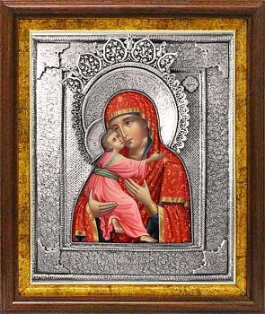 Также икона Божией Матери может быть изготовлена в басменном окладе, в резной круглой раме.