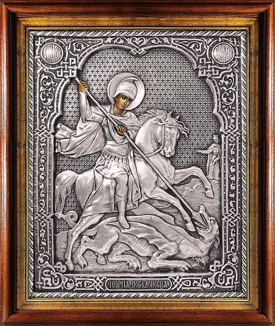 • Образ святого мученика Георгия Победоносца с копьем выполнен в традициях иконописи мастеров XIX века методом УФ печати. Краски отличаются высокой износостойкостью, влагостойкостью, атмосферостойкостью, а следовательно — долговечностью.