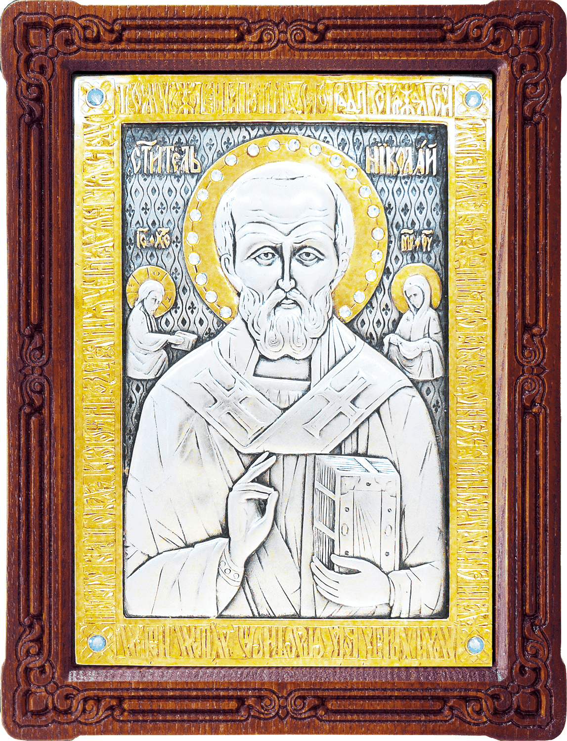 Посеребренная икона Николая, свт. Мирликийского, чудотворца, изготовлена методом гальванопластики Cu9990 — 0,5 мм, с последующей ручной обработкой и серебрением Ag9990 — 10 мкм, золочением Au9990 — 0,5 мкм, покрыты антикоррозийным лаком.